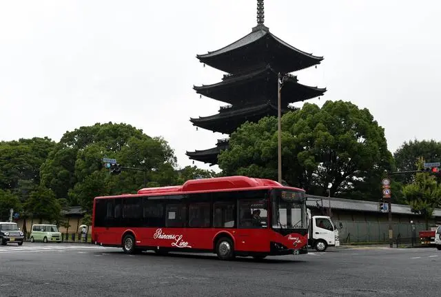 2018年6月20日,比亞迪電動(dòng)巴士行駛在日本京都東寺大街。(新華社記者馬平攝)