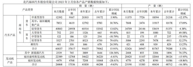 3月6日,福田汽車發(fā)布2023年2月產(chǎn)銷數(shù)據(jù)快報稱,2月銷售汽車60037輛,高于2022年同期的37617輛。2月新能源汽車售出2539輛,高于2022年同期的745輛,同比增加136.56%。