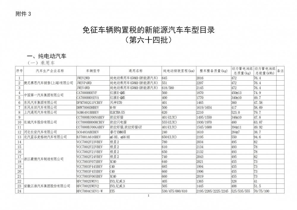 4月17日,工業(yè)和信息化部發(fā)布《免征車(chē)輛購(gòu)置稅的新能源汽車(chē)車(chē)型目錄》(第六十四批)公告,涵蓋純電動(dòng)汽車(chē)、插電式混合動(dòng)力汽車(chē)和燃料電池汽車(chē)三個(gè)大的類型。