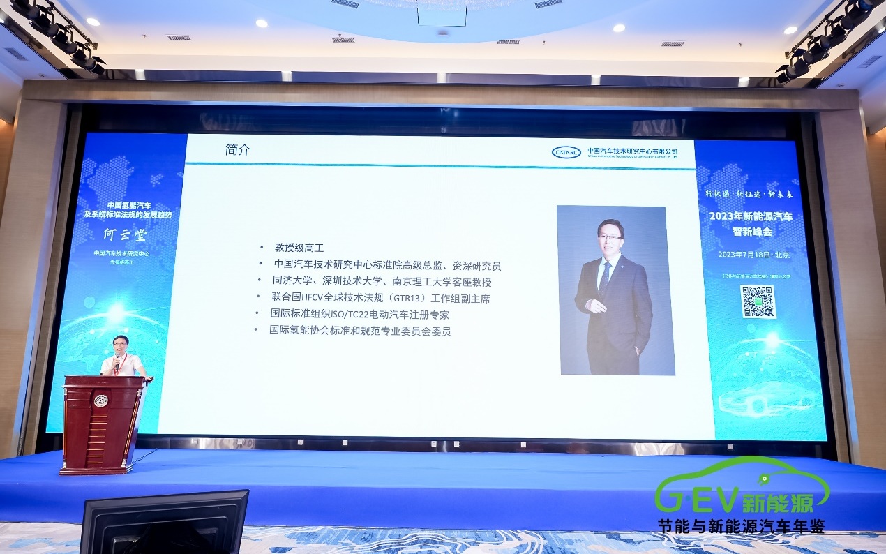 峰會現(xiàn)場,中國汽車技術(shù)研究中心有限公司標(biāo)準(zhǔn)院高級總監(jiān)、資深研究員何云堂發(fā)表了《中國氫能汽車及系統(tǒng)標(biāo)準(zhǔn)法規(guī)的發(fā)展趨勢》主旨報告。該報告分享了中國燃料電池汽車標(biāo)準(zhǔn)和聯(lián)合國燃料電池汽車全球技術(shù)法規(guī)等內(nèi)容,并對重點(diǎn)標(biāo)準(zhǔn)進(jìn)行了解讀。