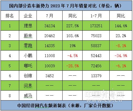 8月1日,幾家國(guó)內(nèi)造車(chē)新勢(shì)力的銷(xiāo)量數(shù)據(jù)如期而至。數(shù)據(jù)顯示,7月,理想、蔚來(lái)、零跑、小鵬和哪吒的銷(xiāo)量分別為34134輛、20462輛、14335輛、11008輛、10039輛,同比分別增長(zhǎng)227.5%、103.6%%、19%、-4.5%、-28.5%;前7個(gè)月的累計(jì)銷(xiāo)量分別為173251輛、75023輛、58837輛、52443輛、72456輛,同比分別增長(zhǎng)144.6%、23.2%、-8.1%、-34.9%、-6.1%。另?yè)?jù)創(chuàng)維汽車(chē)官方發(fā)布的數(shù)據(jù)顯示,其7月共交付3452輛,其中海外出口974輛,同比增長(zhǎng)151.42%。