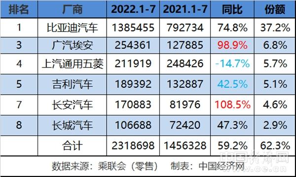 傳統(tǒng)新能源延續(xù)著近幾個月來的競爭格局。7月,6家上榜的傳統(tǒng)品牌合計銷量達411166輛,同比增長46.2%;其中,比亞迪、廣汽埃安穩(wěn)居前兩名,吉利、長安、上汽通用五菱、長城銷量均在3萬輛上下。前7月,傳統(tǒng)新能源依然是這6家企業(yè)上榜,合計銷量超過231萬輛,同比增長59.2%。