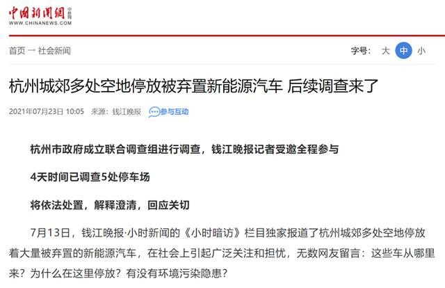 中新網(wǎng)轉載《錢江晚報》相關報道截圖據(jù)后續(xù)報道,調(diào)查組發(fā)現(xiàn),杭州各郊區(qū)停放被棄置的新能源汽車的原因不一。例如,杭州西湖區(qū)雙浦街道老沙村停車場中的新能源汽車因“續(xù)航里程短”,在當時“已被市場淘汰”;而拱墅區(qū)拱康路半山附近停車場的車輛“已上牌”,屬于“臨時停放”,“準備投放市場”。對此,時任調(diào)查組負責人表示,將摸排杭州市區(qū)周邊有關新能源車停車場,形成“一場一檔”和“企業(yè)車輛兩張清單”,“如有違法,依法處置;如無違法,也將解釋澄清,回應關切”。綜上所述,網(wǎng)傳“中國正在丟棄大量的汽車,任其腐爛”的說法存在誤導,相關圖片和視頻中的汽車多為6年以前的車型,已經(jīng)被市場淘汰,并無“浪費”一說。