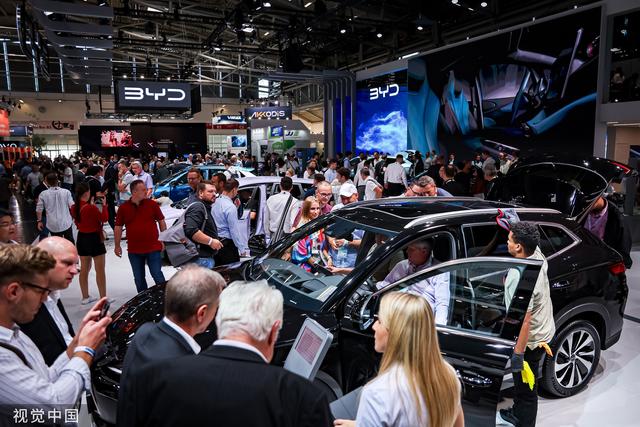 當地時間2023年9月6日,在德國慕尼黑舉行的2023國際車展上,參觀者在觀看中國汽車品牌比亞迪的新能源汽車。@視覺中國