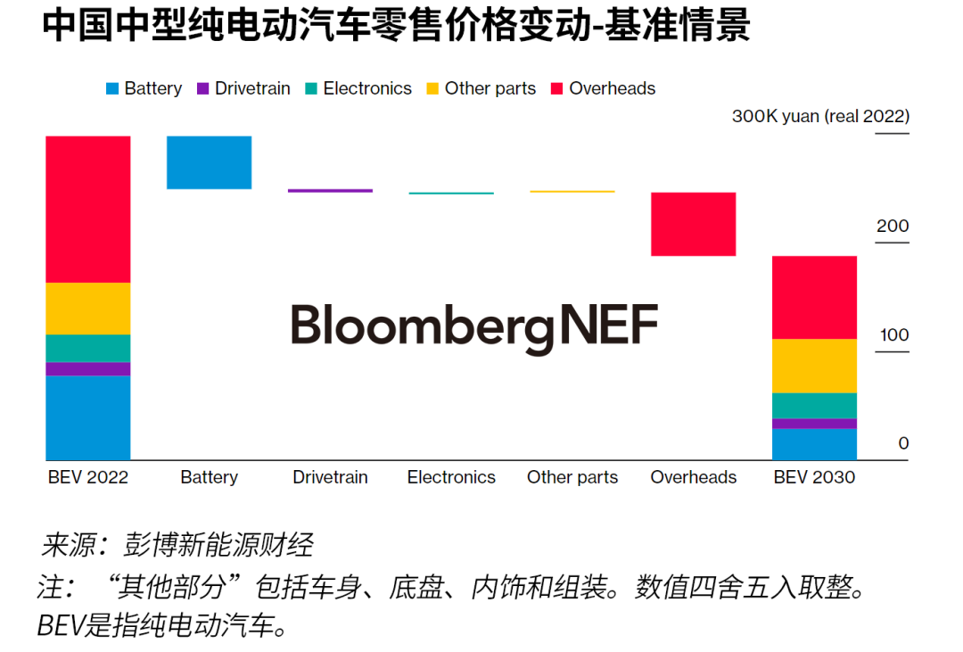 降低成本對(duì)新能源車(chē)企至關(guān)重要,因?yàn)榇蠖鄶?shù)車(chē)企尚未從新能源汽車(chē)的銷(xiāo)售中獲利。彭博新能源財(cái)經(jīng)估計(jì),從2022年到2030年底,電池價(jià)格下跌以及轉(zhuǎn)用專(zhuān)用平臺(tái)可能會(huì)使中國(guó)純電動(dòng)汽車(chē)價(jià)格下降40%。結(jié)合其他零部件和系統(tǒng)的改進(jìn),這可能會(huì)推動(dòng)純電動(dòng)汽車(chē)在2027年至2029年間實(shí)現(xiàn)燃油車(chē)平價(jià)。更廉價(jià)的電池、平臺(tái)協(xié)同效應(yīng)和產(chǎn)業(yè)價(jià)值鏈整合也是大眾汽車(chē)和比亞迪等公司成本降低路線圖的核心。
