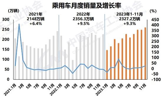 綜合1-11月,乘用車產(chǎn)銷分別完成2344.1萬輛和2327.2萬輛,同比分別增長8%和9.3%。其中,乘用車國內(nèi)銷量為1955.2萬輛,同比增長2.7%;出口372萬輛,同比增長65.1%。