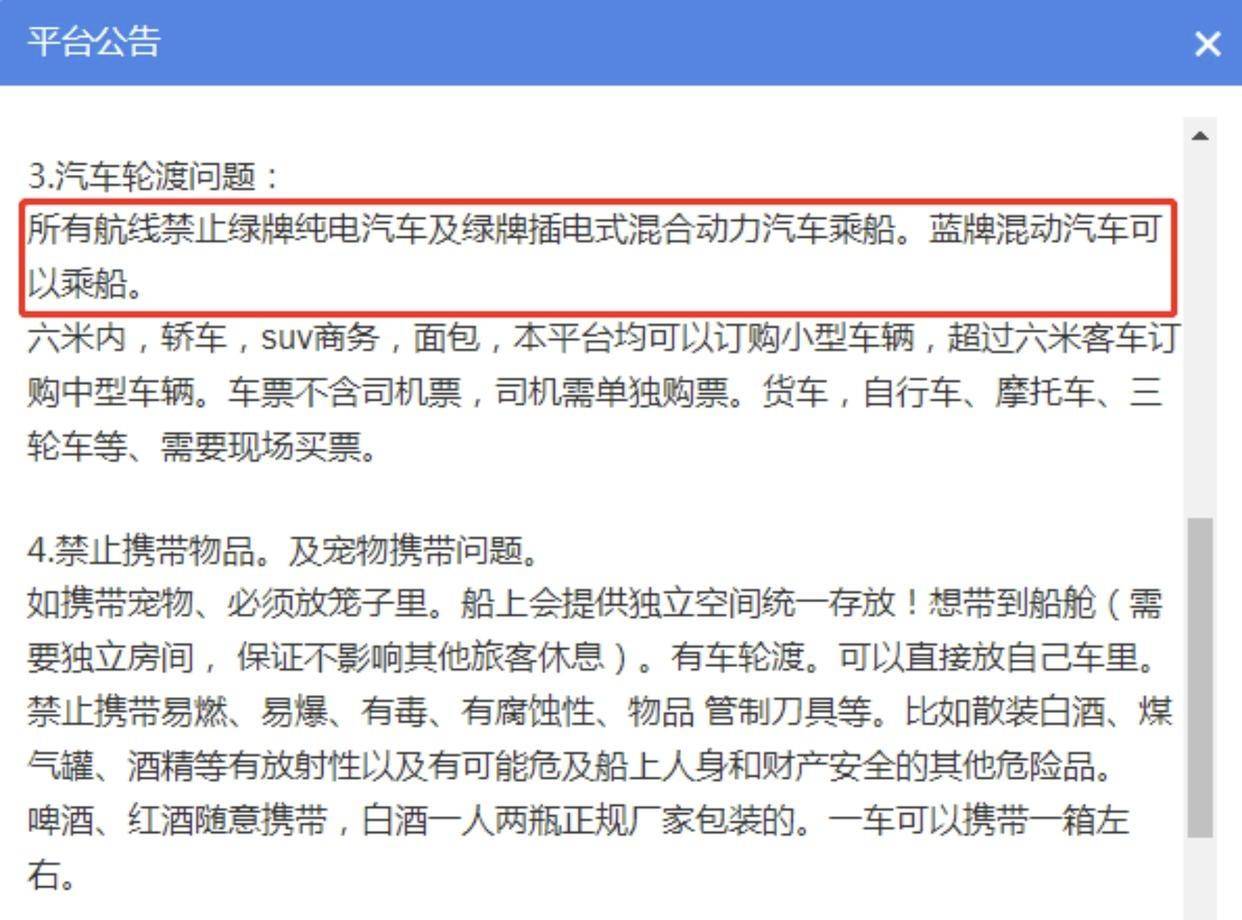 頂端新聞?dòng)浾邫z索此前報(bào)道發(fā)現(xiàn),2023年7月,曾有網(wǎng)友發(fā)文稱:大連港的輪渡規(guī)定,航線藍(lán)牌混動(dòng)汽車可以乘船,禁止綠牌純電汽車及綠牌插電式混合動(dòng)力汽車乘船。