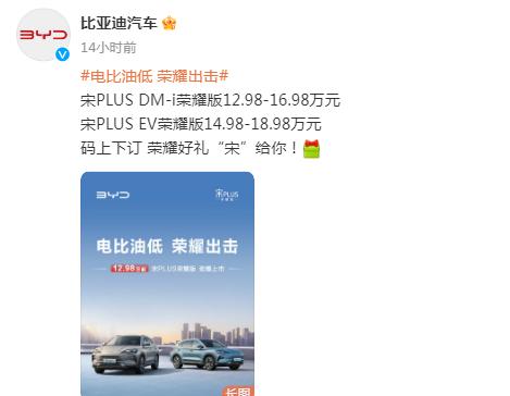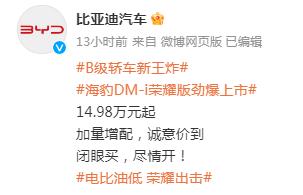 2月29日,比亞迪再出“王炸”。當天,比亞迪汽車發(fā)布微博稱,宋PLUS DM-i榮耀版12.98萬—16.98萬元;宋PLUS EV榮耀版14.98萬—18.98萬元。同時,比亞迪還推出B級轎車“新王炸”——海豹DM-i榮耀版勁爆上市,14.98萬元起。