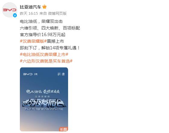 而在2月28日,比亞迪漢唐榮耀版車型正式上市,官方指導價16.98萬元起。具體來看,漢EV榮耀版共4款車型,售價17.98萬—24.98萬元;漢DM-i榮耀版共5款車型,售價16.98萬—22.58萬元;2024款漢DM-p戰(zhàn)神版共1款車型,售價25.98萬元;唐DM-i榮耀版共4款車型,售價17.98萬—21.98萬元。