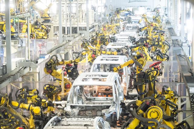 4月1日,在位于湖北武漢經(jīng)開區(qū)的嵐圖汽車電動化焊裝車間,機器人在流水線上作業(yè)。新華社記者肖藝九攝