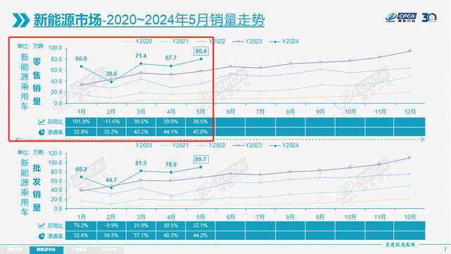 據(jù)乘聯(lián)會(huì)數(shù)據(jù),5月新能源車(chē)國(guó)內(nèi)零售滲透率達(dá)到47.0%,較去年同期33%的滲透率大幅提升了14個(gè)百分點(diǎn)。