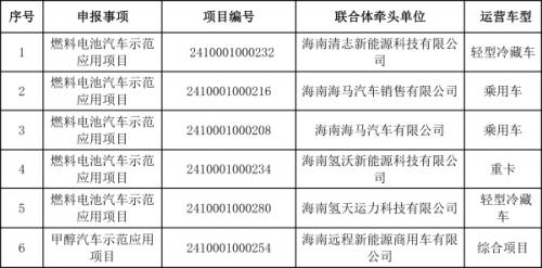 根據(jù)《關于開展海南省燃料電池汽車等技術示范應用項目第一批(2023-2024年)申報工作的通知》(瓊工信汽車〔2024〕25號)有關要求,經(jīng)企業(yè)聯(lián)合體自愿申報、市縣工信主管部門推薦、專家評審和公示等程序,確定海南清志新能源科技有限公司等為牽頭單位的6個項目入圍海南省第一批(2023-2024年)燃料電池汽車等技術示范應用項目(見下表),現(xiàn)予以公布。對入圍6個項目將采取“賽馬制”方式對優(yōu)先達到第一階段車輛推廣任務的4個項目納入本批次支持范圍,其他按要求完成的項目遞補至下一批次示范應用項目中,按下一批次獎勵標準執(zhí)行。