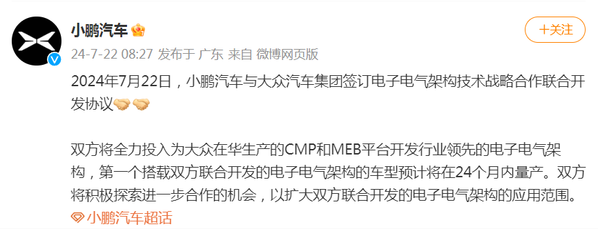 今年以來(lái),小鵬汽車與大眾汽車集團(tuán)已簽署三個(gè)協(xié)議。除上述兩個(gè)電子電氣架構(gòu)相關(guān)協(xié)議外,今年2月29日,小鵬汽車與大眾集團(tuán)宣布,簽訂平臺(tái)與軟件聯(lián)合開(kāi)發(fā)協(xié)議,加速兩款B級(jí)純電動(dòng)汽車的聯(lián)合研發(fā),將于2026年上市,面向中國(guó)市場(chǎng),首款車型為SUV。
