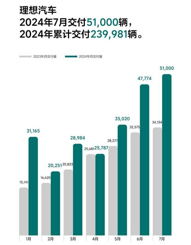 理想汽車在7月交付新車51000輛,創(chuàng)月交付量的歷史新高,同比增長49.4%。今年1-7月,理想共計交付239981輛。截至2024年7月31日,理想汽車累計交付873345輛。