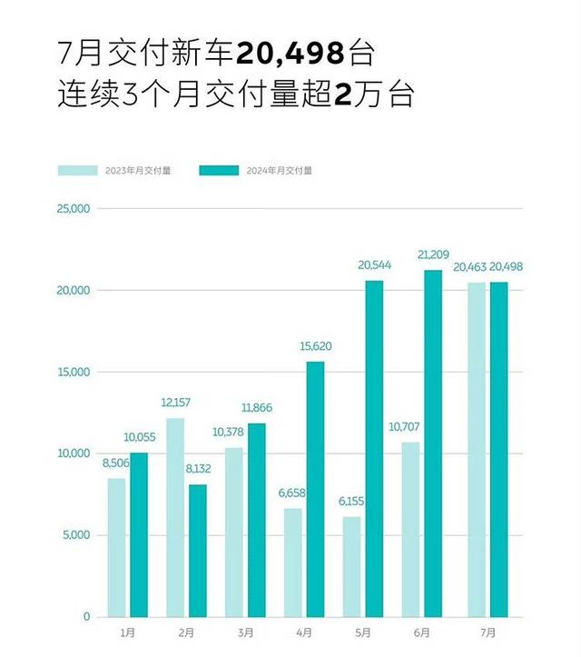 蔚來7月共計交付新車20498臺,同比增長0.17%,連續(xù)3個月交付量超2萬臺。今年1-7月,蔚來共交付新車107924臺,同比增長43.85%。截至目前,蔚來已累計交付新車557518臺。