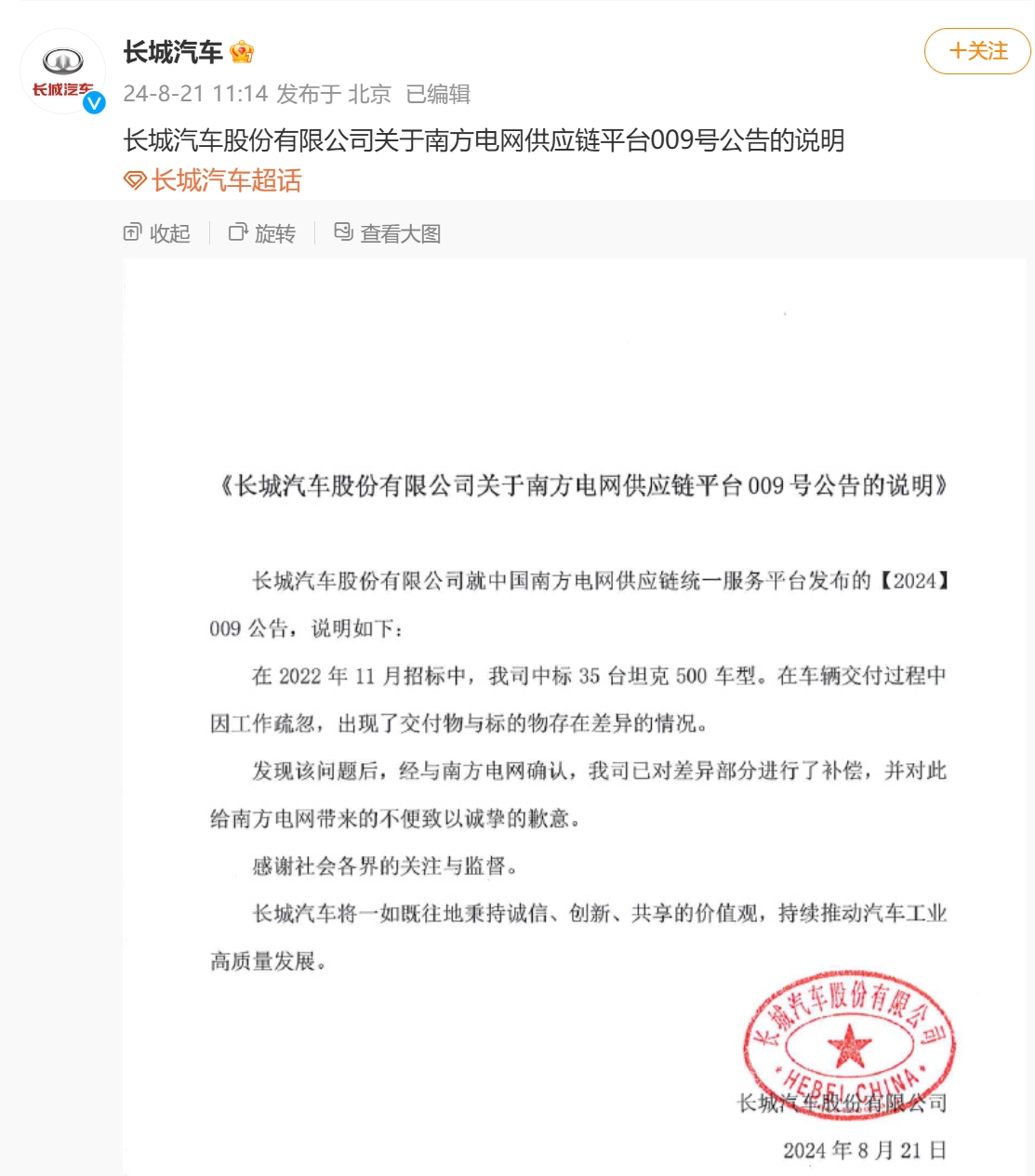 8月21日,長(zhǎng)城汽車發(fā)布關(guān)于南方電網(wǎng)供應(yīng)鏈平臺(tái)009號(hào)公告的說(shuō)明。長(zhǎng)城汽車稱,在2022年11月招標(biāo)中,長(zhǎng)城汽車中標(biāo)35臺(tái)坦克500車型。在車輛交付過程中因工作疏忽,出現(xiàn)了交付物與標(biāo)的物存在差異的情況。發(fā)現(xiàn)該問題后,經(jīng)與南方電網(wǎng)確認(rèn),長(zhǎng)城汽車已對(duì)差異部分進(jìn)行了補(bǔ)償,并對(duì)此給南方電網(wǎng)帶來(lái)的不便致以誠(chéng)摯的歉意。此前,根據(jù)南方電網(wǎng)發(fā)布的供應(yīng)商處理公告,長(zhǎng)城汽車被南方電網(wǎng)列為“不接受投標(biāo)”的供應(yīng)商。