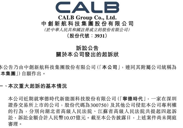 日前,中創(chuàng)新航發(fā)布公告稱,已向?qū)幍聲r代及相關(guān)公司侵犯其專利權(quán)提起四項訴訟,索賠金額合計10.07億元。
