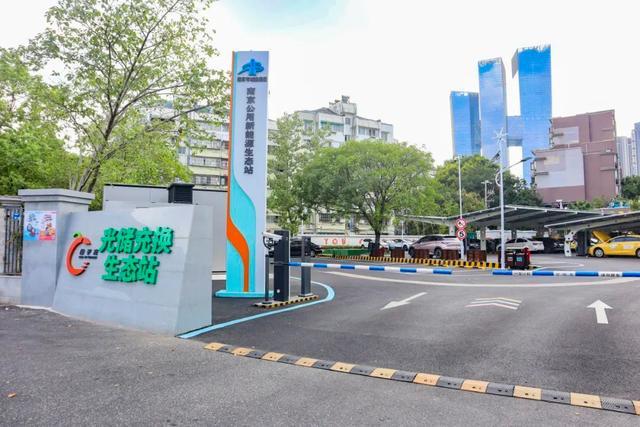 建鄴區(qū)湖西街“光儲充換”生態(tài)示范站,占地約3500平方米,利用車位棚頂、休息室屋頂建設(shè)光伏系統(tǒng),配合分布式儲能設(shè)備,共設(shè)36個充電車位,儲能柜蓄滿電約645千瓦時,最多可供15—20輛新能源車充電。