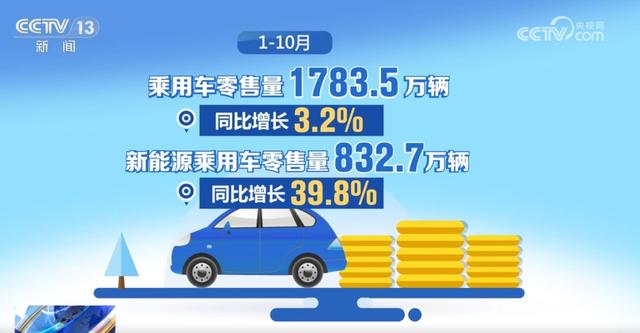 在以舊換新政策的帶動下,汽車銷量也有了明顯增長。10月份,乘用車零售量226.1萬輛,同比增長11.3%,增速較9月加快6.8個百分點(diǎn)。其中,新能源乘用車零售量119.6萬輛,同比增長56.7%,增速較9月加快5.8個百分點(diǎn),占乘用車零售量的比重達(dá)52.9%。1—10月,乘用車零售量1783.5萬輛,同比增長3.2%。其中,新能源乘用車零售量832.7萬輛,同比增長39.8%。(央視網(wǎng))
