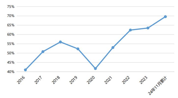 其中,我國(guó)新能源車銷售領(lǐng)域在全球的占比,早在2023年就已達(dá)到64%的絕對(duì)高位;2024年1-11月,我國(guó)新能源車銷售領(lǐng)域全球占比繼續(xù)保持69.6%的份額,其中10-11月我國(guó)新能源乘用車世界份額更是達(dá)到76%。(數(shù)據(jù)來源:Wind、中信建投期貨、乘聯(lián)會(huì),統(tǒng)計(jì)區(qū)間:2023.01.01-2024.11.30)