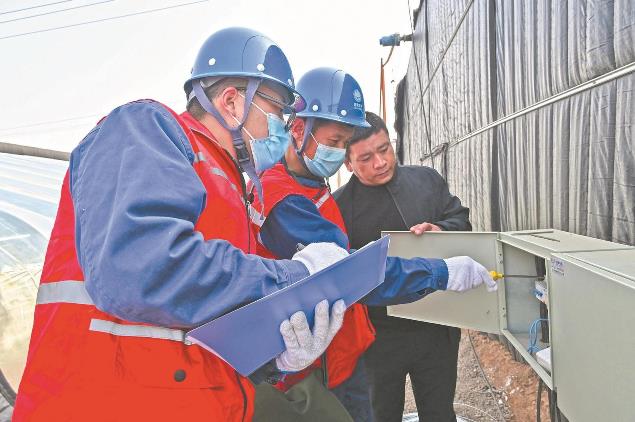 國家電網(wǎng)河北電力(深澤)共產(chǎn)黨員服務(wù)隊(duì)隊(duì)員來到深澤縣森海糧食種植專業(yè)合作社,幫助企業(yè)檢查用電設(shè)施。張建峰 攝