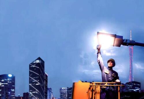 圖為廣州供電局運維人員正在高空作業(yè)車上將傳統(tǒng)路燈更換為LED節(jié)能燈。