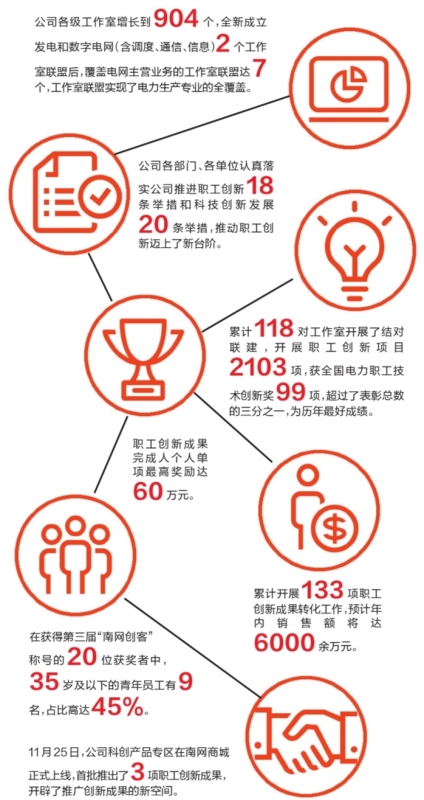 2019年,南方電網(wǎng)公司各部門、各單位認(rèn)真落實(shí)公司推進(jìn)職工創(chuàng)新的18條舉措和科技創(chuàng)新發(fā)展20條舉措,以工作室聯(lián)盟為抓手,進(jìn)一步整合全網(wǎng)職工創(chuàng)新力量,打造了更廣闊的創(chuàng)新協(xié)作平臺,為職工創(chuàng)新創(chuàng)造更好的條件;通過建章立制、搭建平臺,打通了創(chuàng)新成果轉(zhuǎn)化的“最后一公里”;通過開展培訓(xùn)、經(jīng)驗(yàn)交流、成果展覽,使優(yōu)秀成果及創(chuàng)新經(jīng)驗(yàn)實(shí)現(xiàn)了共享。今年,公司在職創(chuàng)實(shí)施、項(xiàng)目獲獎(jiǎng)、成果轉(zhuǎn)化等方面,創(chuàng)造了南網(wǎng)職創(chuàng)新高度。