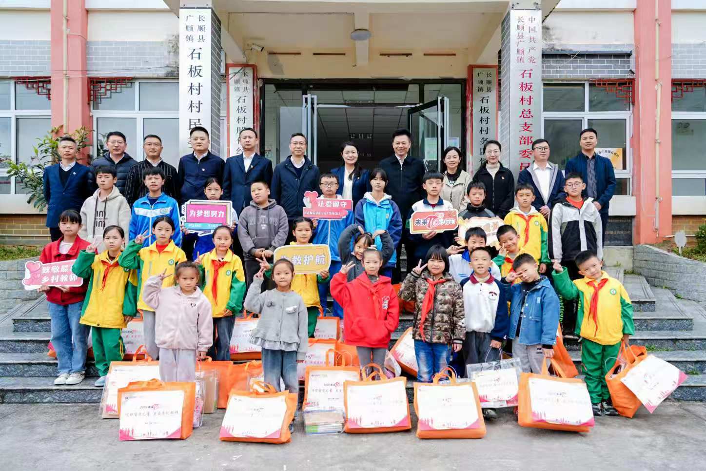 慰問環(huán)節(jié)中,李文華為鄉(xiāng)村教師送上愛心體檢卡,武琳向石板村黨支部捐贈空調(diào)和辦公電腦,與會代表共同為24名留守兒童代表送上羽絨服、文具套裝、課外讀物等學(xué)習(xí)生活用品。隨后,石板村向公司贈送錦旗,以此表達對公司持續(xù)幫扶的誠摯謝意。