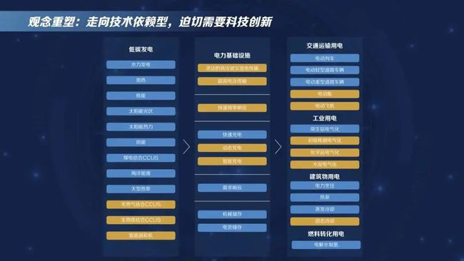 國(guó)際能源署(IEA)給出的技術(shù)評(píng)估,分別對(duì)低碳發(fā)電、電力基礎(chǔ)設(shè)施、交通運(yùn)輸用電、工業(yè)用電、建筑物用電、燃料轉(zhuǎn)化用電等技術(shù)做了梳理分析,在低碳發(fā)電領(lǐng)域像太陽(yáng)能光伏發(fā)電等技術(shù)已經(jīng)基本比較成熟,可以走向市場(chǎng);在電力基礎(chǔ)設(shè)施領(lǐng)域,智能充電等技術(shù)目前還需要進(jìn)一步研發(fā)、競(jìng)爭(zhēng),才能推向市場(chǎng)。IEA2021年的最新報(bào)告顯示在全球能源行業(yè)的路線(xiàn)圖里,2050年實(shí)現(xiàn)凈零排放的關(guān)鍵技術(shù)中,50%目前尚未成熟,需要進(jìn)一步研發(fā)提升,可見(jiàn)走向技術(shù)依賴(lài)型的經(jīng)濟(jì)發(fā)展模式對(duì)科技創(chuàng)新的需求更加迫切。