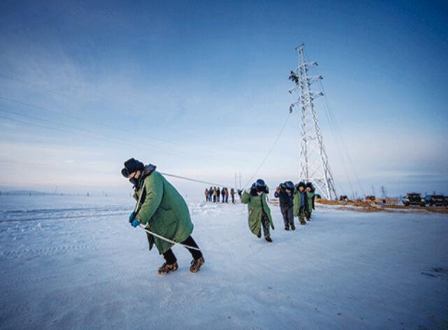 11月25日,錫林郭勒盟蘇尼右旗滴水成冰,20多名身著軍大衣、頭戴棉質(zhì)安全帽的工人在白雪皚皚的草原深處喊著號子、齊力拉著導(dǎo)引繩,拖拽著身后近30米高的鐵塔。鐵塔上站著的幾個工人,正吃力地加固塔上的導(dǎo)線。不遠(yuǎn)處挖掘機(jī)、轉(zhuǎn)載機(jī)隆隆作響,一片如火如荼的繁忙景象。