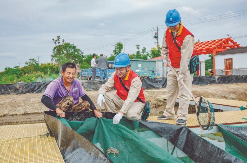 9月30日一早,南京市溧水區(qū)晶橋鎮(zhèn)水晶村的螃蟹養(yǎng)殖戶馬春香忙著給蟹塘中的螃蟹投食。國家電網(wǎng)江蘇電力(南京“金麥穗”)共產(chǎn)黨員服務(wù)隊隊員邰文龍在蟹塘邊檢查供氧設(shè)備和供電線路。“以前都用柴油機,不僅聲音大,氣味也不好聞。”馬春香說,“自打供電公司架了線路后,我們用電很方便,供電員工還經(jīng)常來幫我們檢查設(shè)備。”