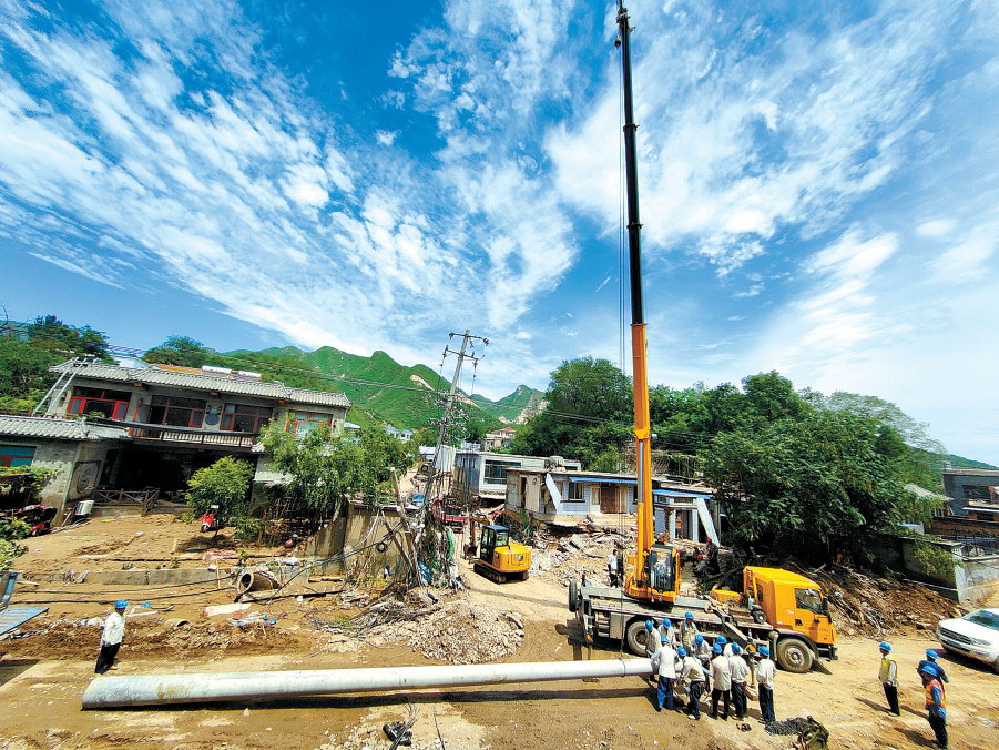 平谷區(qū)支援團隊在青龍湖鎮(zhèn)北車營村,拆除舊的電桿和設備,重新立桿和新裝變壓器。楊雙奇 攝