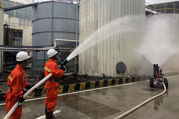 本次演習(xí)模擬火災(zāi)險(xiǎn)情為龍雁工業(yè)園區(qū)一企業(yè)在日常生產(chǎn)過程發(fā)現(xiàn)罐區(qū)內(nèi)的1號(hào)罐體下方有濃煙冒出并帶著明火,且有工作人員由于吸入濃煙暈倒在現(xiàn)場(chǎng)的情況。演練中,龍雁工業(yè)園區(qū)管委會(huì)接到火情后,立即通知該公司專職消防隊(duì)到現(xiàn)場(chǎng)協(xié)同園區(qū)滅火機(jī)器人開展聯(lián)合滅火,消防隊(duì)員與滅火機(jī)器人對(duì)火情危險(xiǎn)的位置進(jìn)行撲救,并對(duì)現(xiàn)場(chǎng)暈迷的人員進(jìn)行救援。經(jīng)過雙方共同配合現(xiàn)場(chǎng)火情得到有效控制,暈迷的人員得到及時(shí)救助,應(yīng)急演練達(dá)到預(yù)期效果。