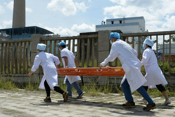 演練以該公司老機(jī)3號(hào)主變壓器異常保護(hù)動(dòng)作跳閘,變壓器冒煙起火展開(kāi),運(yùn)值班員第一時(shí)間撥打電話報(bào)警、向值長(zhǎng)及相關(guān)領(lǐng)導(dǎo)報(bào)告,啟動(dòng)火災(zāi)事故應(yīng)急預(yù)案。同時(shí)按照值長(zhǎng)指令停止運(yùn)行中的設(shè)備并切斷所有相關(guān)設(shè)備電源,迅速利用附近的滅火器組織初起火災(zāi)撲救,等待消防隊(duì)救援。5分鐘后消防隊(duì)趕到現(xiàn)場(chǎng),消防員立即鋪設(shè)消防水帶進(jìn)行滅火,經(jīng)過(guò)10多分鐘的緊張戰(zhàn)斗,火災(zāi)被撲滅,演練圓滿結(jié)束。