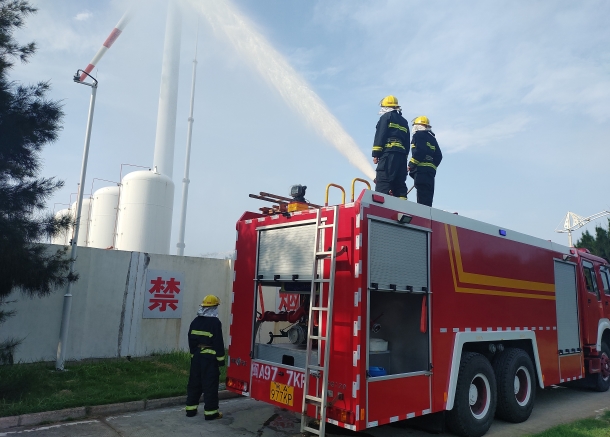 隨著一聲哨響,演練正式開(kāi)始。當(dāng)班值班員巡檢時(shí)在制氫站東側(cè)發(fā)現(xiàn)火情且火勢(shì)有蔓延趨勢(shì),同時(shí)4號(hào)氫罐進(jìn)出口手動(dòng)閥處伴有藍(lán)色火苗,立即將情況匯報(bào)應(yīng)急指揮部,隨即啟動(dòng)火災(zāi)事故專項(xiàng)應(yīng)急預(yù)案。消防隊(duì)及相關(guān)人員馬上趕赴事發(fā)現(xiàn)場(chǎng),開(kāi)展相關(guān)救援及事后恢復(fù)工作。短短幾分鐘,保安已做好周邊人員疏散,為消防工作提供空間保障。消防水炮迅速響應(yīng),現(xiàn)場(chǎng)火勢(shì)及氫氣儲(chǔ)罐的溫度得到了有效控制,同時(shí)在運(yùn)行人員與消防隊(duì)員緊密配合下,殘余火苗也被徹底撲滅,氫罐閥門泄漏及相關(guān)缺陷在檢修隊(duì)伍的協(xié)助下得以快速消除,制氫站恢復(fù)正常生產(chǎn),演練圓滿結(jié)束。