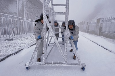 在冰凍中連續(xù)作業(yè)二、三個小時,冰雪落在他們的帽子上、衣服上、鞋上,凝結(jié)成僵硬的冰塊;吹在頭發(fā)上、胡渣上,化作冰花將他們變成“守護平安”的圣誕老人模樣。