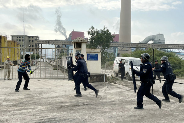 按照演習(xí)方案,兩名“假想嫌疑人”持器械翻越生產(chǎn)區(qū)域3號門,企圖闖入油泵房破壞生產(chǎn)設(shè)施。生產(chǎn)值班人員發(fā)現(xiàn)歹徒欲行闖入,立即上報(bào),同時(shí)進(jìn)行攔截。該公司應(yīng)急辦迅速啟動(dòng)應(yīng)急預(yù)案,并向公安機(jī)關(guān)報(bào)警,要求出警支援。接到報(bào)警后,鎮(zhèn)派出所快速組織警力趕到事發(fā)現(xiàn)場,幾經(jīng)周旋,與公司內(nèi)保人員一起將“恐怖分子”控制抓捕。演練過程中,該公司各個(gè)部門反映迅速,配合默契,采取處置措施及時(shí)、合理、表現(xiàn)出良好的處理突發(fā)事件的能力。