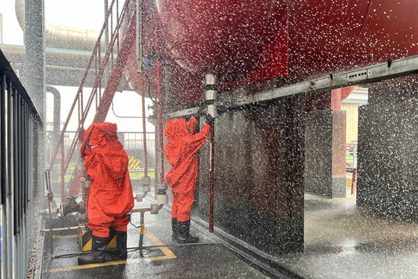 本次演練模擬該公司輔控人員巡檢過程中發(fā)現1號鹽酸罐出口管泄露,有大量的酸霧冒出,并立即匯報當班值長,值長確定人員及鹽酸泄漏情況后啟動鹽酸泄漏事故應急處置預案。組織相關人員立即拉開警戒線,參與演練的員工著防酸服等防護用品進入現場,對鹽酸泄漏點進行現場搶修、隔離,消防隊員用消防水槍噴水霧壓制現場酸霧,將含酸廢水引至酸堿廢水池進行中和處理。演練過程緊張有序,順利完成。演練結束后,相關安全管理負責人結合現場情況,對此次應急演練工作進行了點評,并與參演人員討論分析了各處置環(huán)節(jié)的不足之處和改進建議。