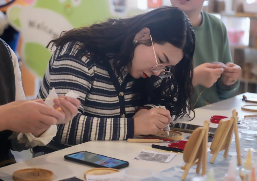 活動中大家興致勃勃地上手在木質杯墊上制作琺瑯畫,用細膩柔軟的金絲,貼在裝飾圖紋上,通過配色、填沙等步驟,逐步制作出一件件別具一格、匠心獨制的藝術作品,大家興趣盎然,彼此交流,共同分享動手制作的體會和收獲的喜悅,共品非遺藝術魅力。掐絲琺瑯工藝是一種傳統(tǒng)的中國手工藝,用金屬細絲掐出圖案后填充各種顏色的琺瑯彩料,經過多道工序,制成精美器物。本次體驗活動進行掐絲琺瑯手工杯墊制作,作品可以永久保存,永不褪色,并具有很好的觀賞性和收藏價值。