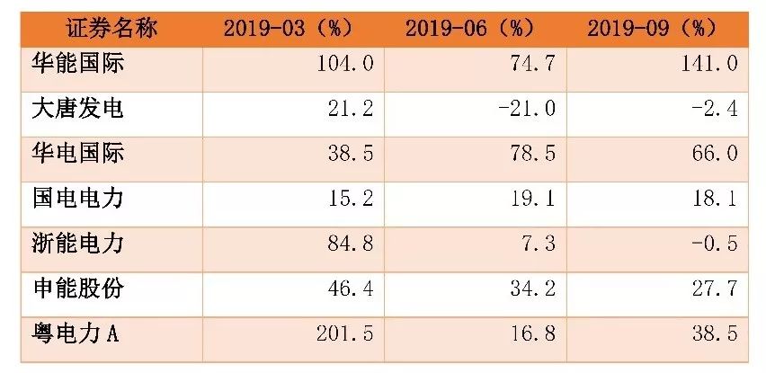 2019 年前三季度華能國際(5.700, 0.03, 0.53%)、華電國際(3.650, 0.01, 0.27%)、國電電力(2.290, -0.01, -0.43%)、大唐發(fā)電(2.420, 0.00, 0.00%)收入增速在0-10%,凈利潤除大唐發(fā)電之外前三季度均保持較高增長。收入增速的變化主要是受到電價同比提升和發(fā)電量增速回升的影響。