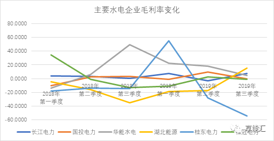 2019年前三季度水電公司長江電力(18.010, 0.01, 0.06%)發(fā)電量增速為-2%、華能水電(4.360, 0.02, 0.46%)發(fā)電量增速為36%、桂冠電力(4.600, 0.01, 0.22%)發(fā)電量增速為-2%、國投電力(8.660, 0.04, 0.46%)發(fā)電量增長為8%。受季節(jié)水量變化影響,長江電力、華能水電、國投電力發(fā)電量增速均較前一季度有所下滑。受水量的影響,可以看到前幾大企業(yè)毛利率同比變化明顯。