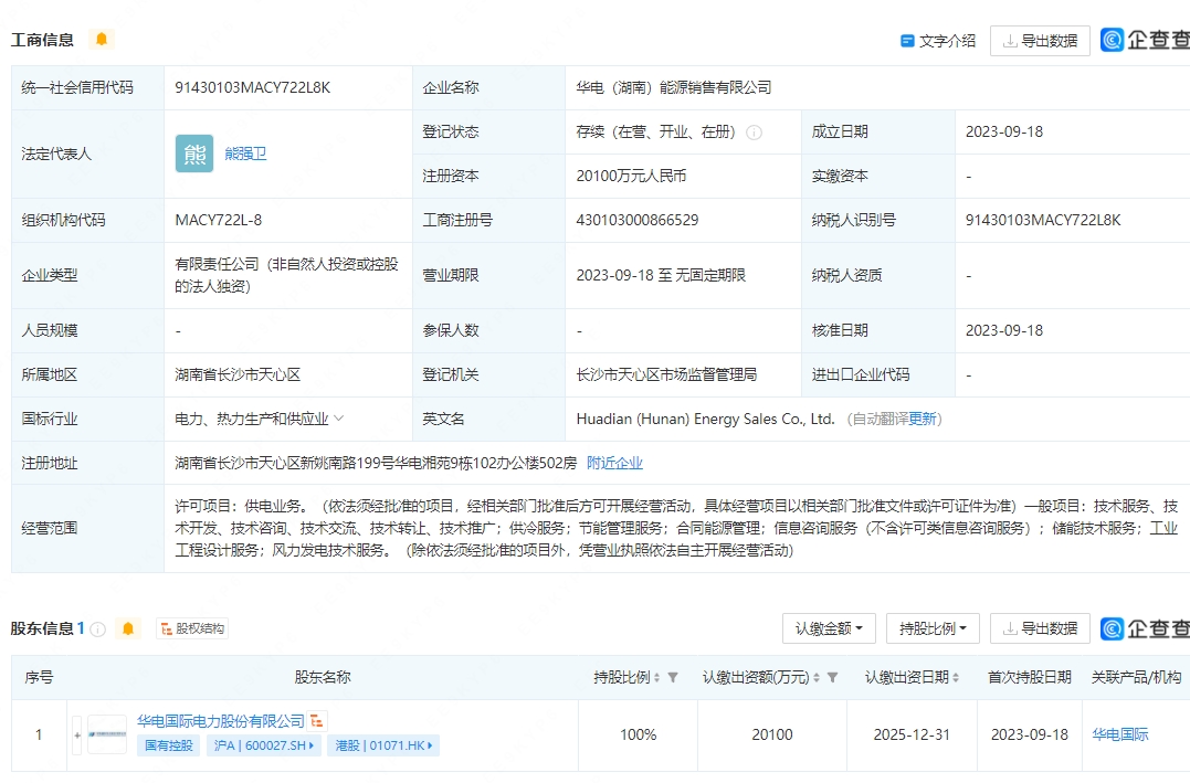 企查查APP顯示,近日,華電(湖南)能源銷售有限公司成立,法定代表人為熊強(qiáng)衛(wèi),注冊(cè)資本2億余元,經(jīng)營(yíng)范圍包含:儲(chǔ)能技術(shù)服務(wù);工業(yè)工程設(shè)計(jì)服務(wù);風(fēng)力發(fā)電技術(shù)服務(wù)等。企查查股權(quán)穿透顯示,該公司由華電國(guó)際100%控股。(每日經(jīng)濟(jì)新聞)