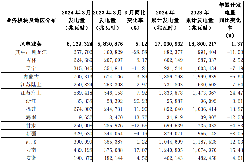 截至2024年3月31日,本公司2024年累計完成發(fā)電量21,225,249兆瓦時,較2023年同期同比增長8.27%。其中,風電發(fā)電量增長1.37%,火電發(fā)電量增長11.30%,其他可再生能源發(fā)電量增長233.33%。2024年3月發(fā)電量詳情如下: