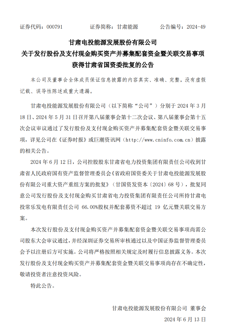甘肅能源發(fā)布公告稱,6月12日,公司控股股東甘肅省電力投資集團(tuán)有限責(zé)任公司收到甘肅省人民政府國有資產(chǎn)監(jiān)督管理委員會《省政府國資委關(guān)于甘肅電投能源發(fā)展股份有限公司重大資產(chǎn)重組方案的批復(fù)》(甘國資發(fā)資本〔2024〕68號),批復(fù)同意公司發(fā)行股份及支付現(xiàn)金購買甘肅省電力投資集團(tuán)有限責(zé)任公司所持甘肅電投常樂發(fā)電有限責(zé)任公司66.00%股權(quán)并配套募資不超過19億元暨關(guān)聯(lián)交易方案。