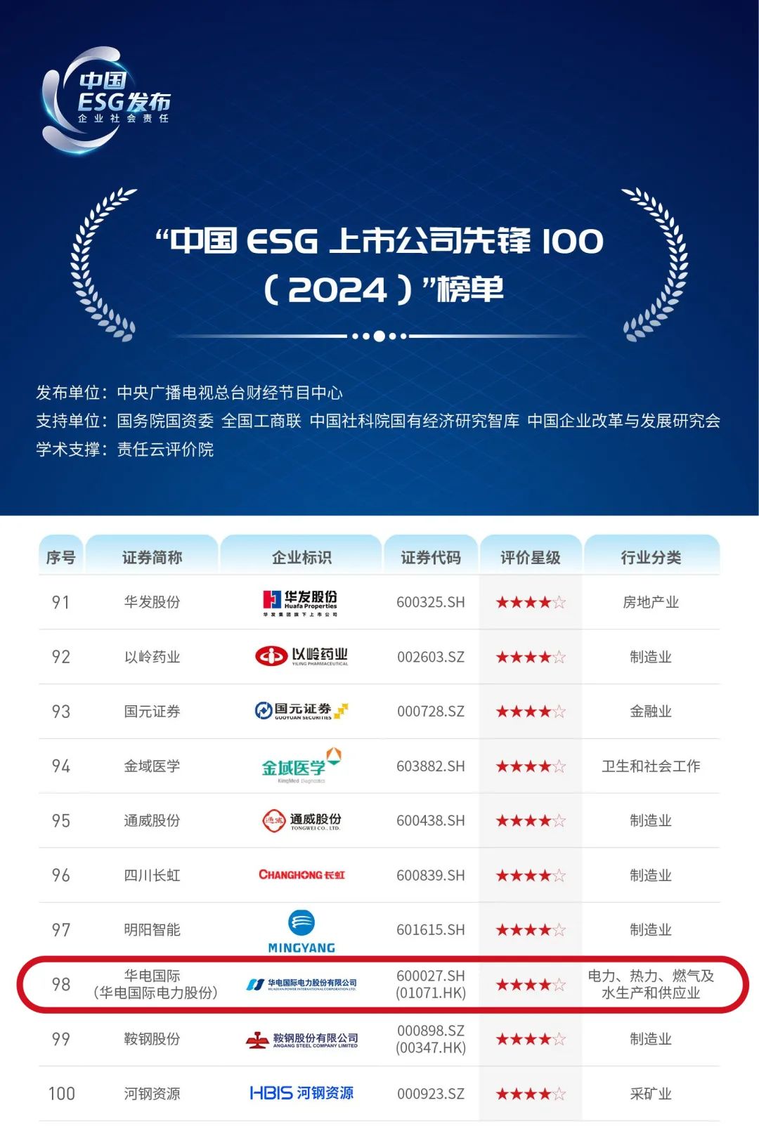 6月30日下午,中央廣播電視總臺財經(jīng)節(jié)目中心聯(lián)合國務(wù)院國資委、全國工商聯(lián)、中國社科院國有經(jīng)濟研究智庫、中國企業(yè)改革與發(fā)展研究會在京正式發(fā)布“中國ESG(企業(yè)社會責任)《2024年度ESG行動報告》”?!秷蟾妗饭剂?ldquo;中國ESG上市公司先鋒100”榜單,中國華電所屬華電國際電力股份有限公司成功入圍。