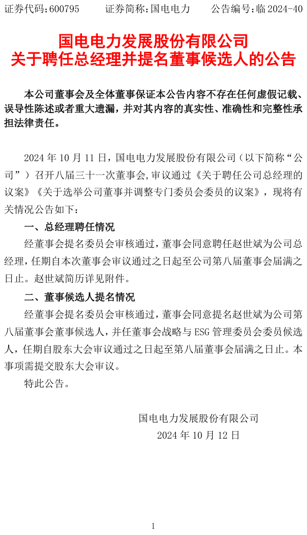 2024年10月11日,國電電力召開八屆三十一次董事會,審議通過《關(guān)于聘任公司總經(jīng)理的議案》《關(guān)于選舉公司董事并調(diào)整專門委員會委員的議案》。經(jīng)董事會提名委員會審核通過,董事會同意聘任趙世斌為公司總經(jīng)理,任期自本次董事會審議通過之日起至公司第八屆董事會屆滿之日止。經(jīng)董事會提名委員會審核通過,董事會同意提名趙世斌為公司第八屆董事會董事候選人,并任董事會戰(zhàn)略與ESG管理委員會委員候選人,任期自股東大會審議通過之日起至第八屆董事會屆滿之日止。