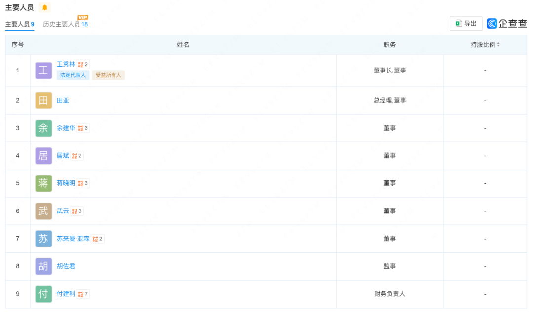 根據(jù)企查查顯示,含董事長(zhǎng)、總經(jīng)理在內(nèi)共6位高層卸任。目前,主要領(lǐng)導(dǎo)為9人。其中,王秀林任董事長(zhǎng)、田亞任總經(jīng)理。