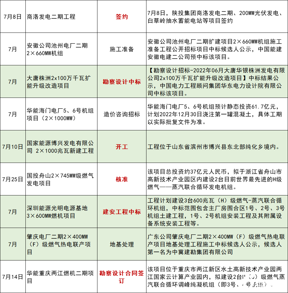 7月份,4個燃氣發(fā)電項目取得重要進展,分別屬于國投集團、深圳能源、國家能源集團、華能集團。