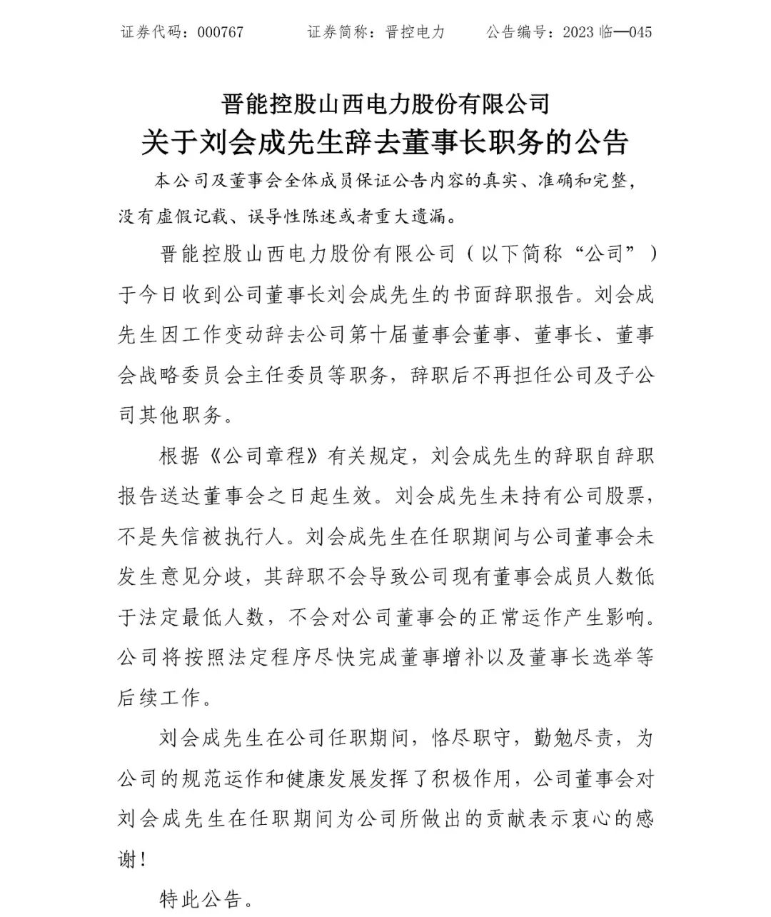 10月11日,晉能控股山西電力股份有限公司發(fā)布公告,劉會成因工作變動辭去公司第十屆董事會董事、董事長、董事會戰(zhàn)略委員會主任委員等職務,辭職后不再擔任公司及子公司其他職務。