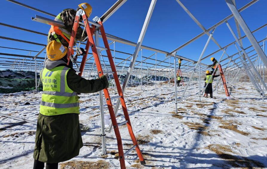 金上昂多項目現(xiàn)場雪一停,施工人員立即搶抓時間安裝光伏支架。